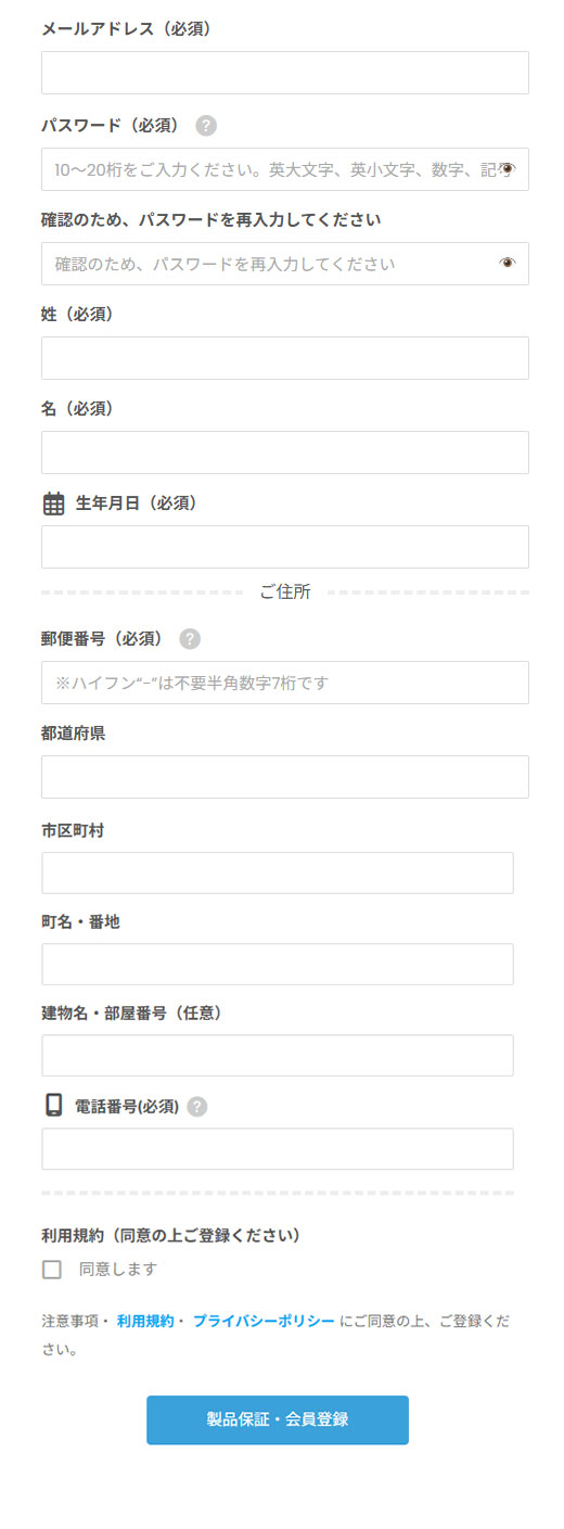 以上を入力の上、ページ下部の「製品保証・会員登録」ボタンをクリックしてください。